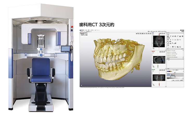 いままでのレントゲンでは見えなかったものが見えるのが特徴です。通常のレントゲンではおおまかな骨の高さしかわからなかったのですが、歯科用CTでは3次元的に観察できるようになったため、骨の高さに加えて幅、骨の質、神経までの距離などが正確に把握できるようになり、安心安全な治療が可能になりました。